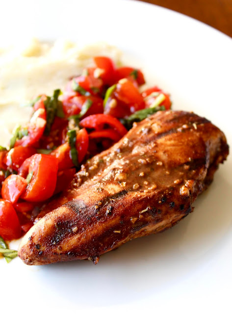 7. Serve grilled chicken with a drizzle of remaining 2 tablespoons marinade evenly among each one. Top each chicken breast with bruschetta mixture. Serve with mashed potatoes, quinoa or rice.